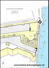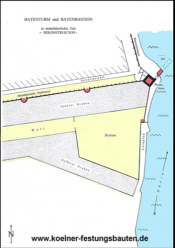 1850/51 Mit Baubeginn des neuen Rheinauhafens wird die mittelalterliche Rheinufermauer abgebrochen und durch eine krenelierte Mauer auf der neugeschaffenen Rheinauhalbinsel ersetzt. Diese Mauer wird über einen offenen Halbturm/Uferkaponniere und einem neuen Zwinger mit dem Bayenturm verbunden.
