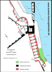 September 2007 Die Ausschachtungsarbeiten werden nach Süden fortgesetzt und dabei Teile der rheinseitigen Bastionsmauer gefunden.