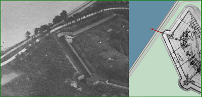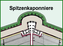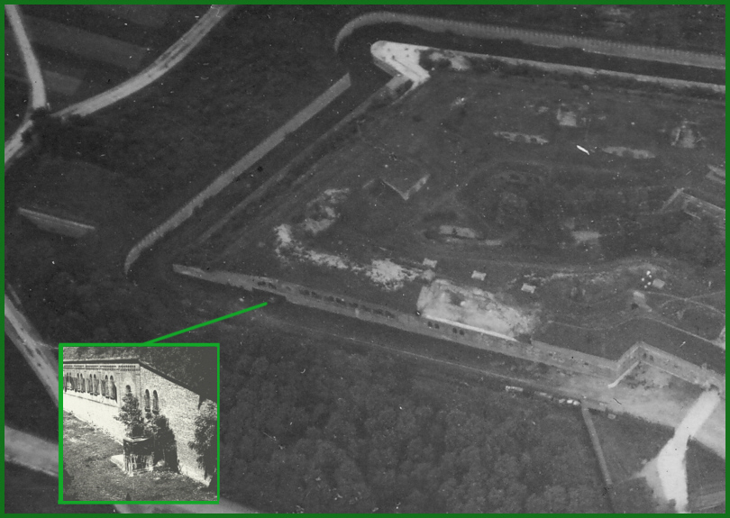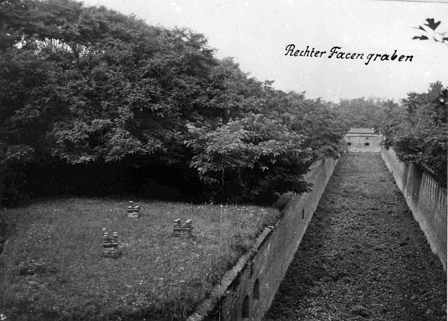 Auf dem äußeren Schulterpunkt auf der Wallkrone erkennt man ein zusätzliches Bauwerk welches nur im Fort I zu sehen ist.Dieser Bau kann nur in Verbindung mit der Entwässerungsanlage gesehen werden.
