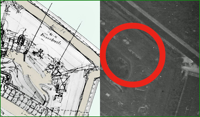 Auf dem Luftbild wurde die Lage des Sicherungskamins markiert, Bedingt durch die Schattenbildung ist das Bauwerk fast nicht zu erkennen.