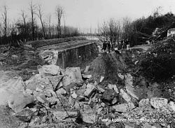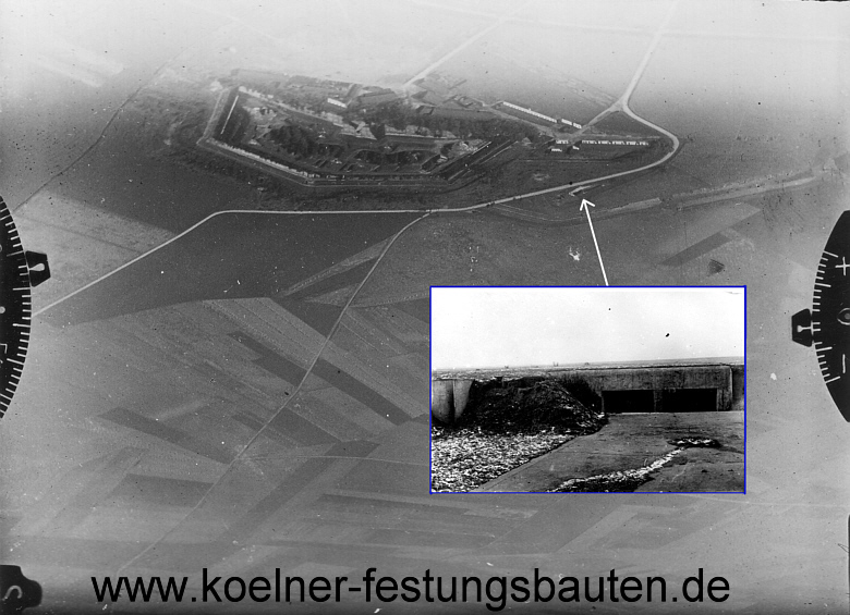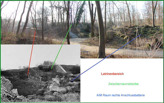 Das S/W-Foto stammt aus der Entfestigungzeit. Zu sehen ist die Kehlkaserne und die rechte Zwischenraumstreiche. Rechts im Vordergrund liegen die Trümmer des A/M-Raumes für die Anschlußbatterie. Auf dem Farbfoto aus dem Jahr 2012 ist die Lage der Zwischenraumstreiche und des A/M-Raumes noch gut zu erkennen.