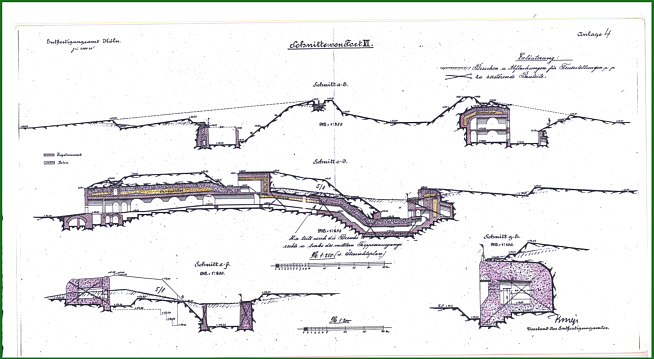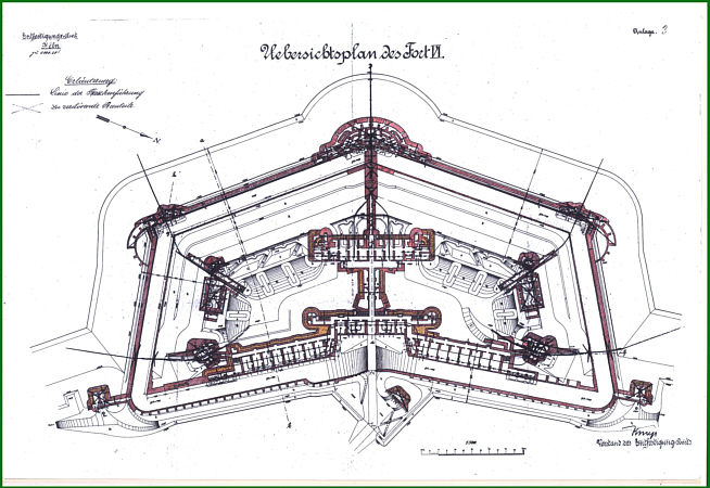 Die Zeichnung zeigt das Fort zur Zeit der Armierung. Im Front, Flanken - und z.T. im Kehlbereich wurden die Drahtsperren bereits verlegt.