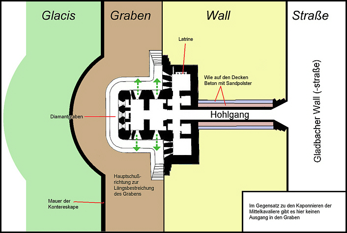 Dort, wo sich in der Regel in der Mitte einer Front ein Mittelkavalier mit Kasematten und Grabenkaponniere befindet, ist hier nur eine Grabenkaponniere mit Hohlgang-Verbindung zur Wallstraße vorhanden.