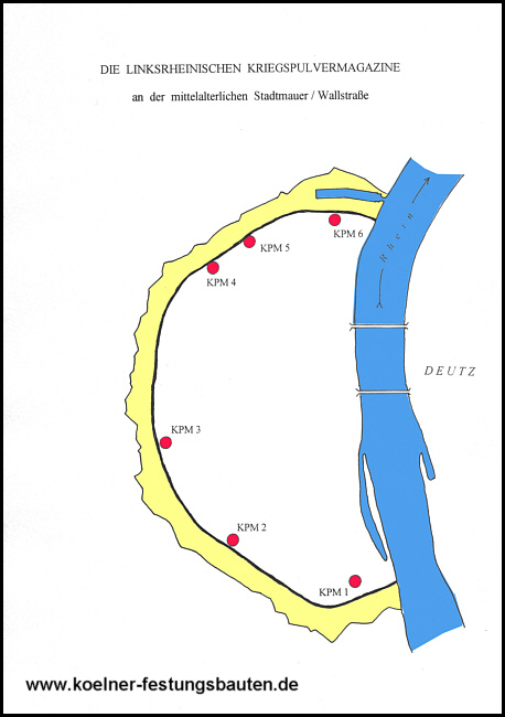 Für die Unterbringungung des Pulvers in Kriegszeiten wurden linksrheinisch im Zuge der Wallstraße unmittelbar hinter der mittelalterlichen Stadtmauer insgesamt 6 Kriegspulvermagazine (KPM) errichtet; die Bauzeit für die ersten fünf lag zwischen 1818 und 1834, ein KPM folgte 1838/41.