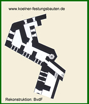 Der kreuzförmge Bau wurde als Reduit beibehalten, wurde aber nicht mittig zur Kehle plaziert.
