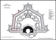 - ein Obergeschoss hauptsächlich zur Bekämpfung eines Feindes auf den Wällen, aus den hinteren/kehlseitigen Kasematten auch zur Flankierung der Nachbarwerke und