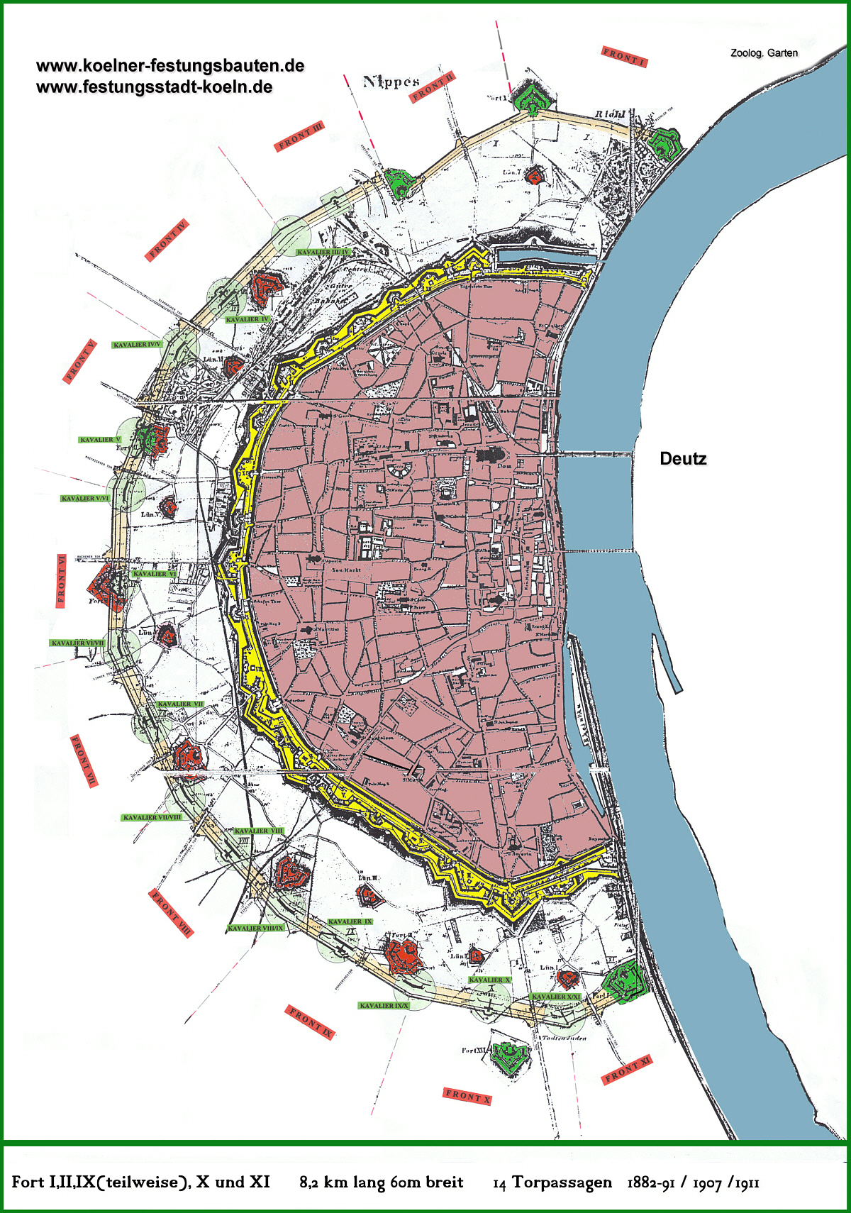 Auf den Plänen ist erkennbar, dass die insgesamt halbkreisförmige Umwallung aus elf gradlinigen Frontabschnitten (Front I-XI) bestand; die Nummerierung beginnt im linksrheinischen Kölner Norden und endet im Süden.