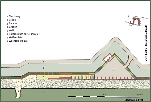 - 12m breiten und 8m tiefen Graben mit gemauerter Kontereskarpe