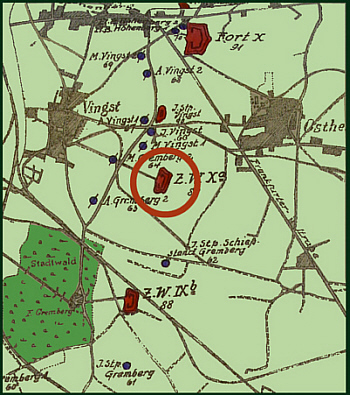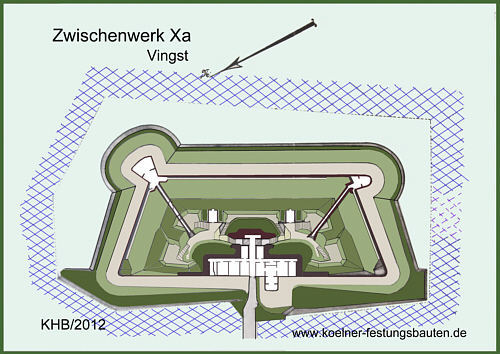 Östlich vom Vingster Ring, nördlich des Hardtgenbuschweges lag das zwischen 1877-1879 erbaute Zwischenwerk Xa (Baugleich mit dem Zwischenwerk IXb).