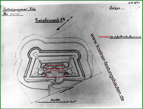 Im Plan des Entfestigungsamt Köln wurde die Spitzenkaserne als zu erhaltener Gebäudeteil eingezeichnet.